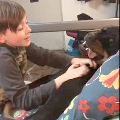 A dog makes a funny growling noise with her tongue sticking out as she is pat by a young boy.
