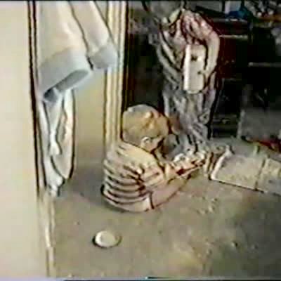 Tot pours powder all over baby's head, then pats it & it smokes up. dumps