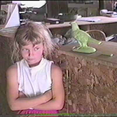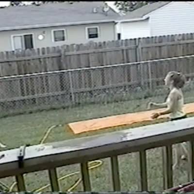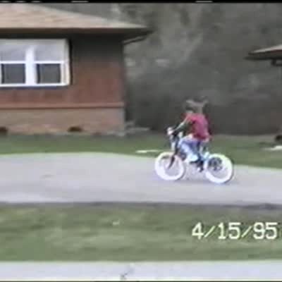 Man rides a tractor lawn mower in the backyard with a girl on his lap. They hit a tree when man is not paying attention & looking at the camera. Girl cries. Bonehead.