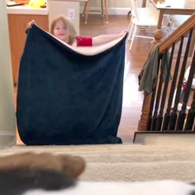 A woman stands at the bottom of the stairs and does the what the fluff challenge for her dog and it runs down the stairs to find her. A young girl does it next, but the dog doesn't pay attention. Then a tot boy goes, but drops the blanket on a second dog and then runs away.