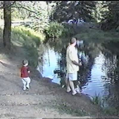 A man on his driveway fills a wheelbarrow with gravel and pushes it up the driveway. He slips, falls, and hits his face against the wheelbarrow. A woman runs to check on him. Security Footage.