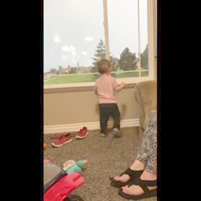 A tot boy runs at a window shade and when he peeks under it, his mom grabs him from behind the shade and pulls him up, making him look like he disappeared behind the window shade repeatedly.