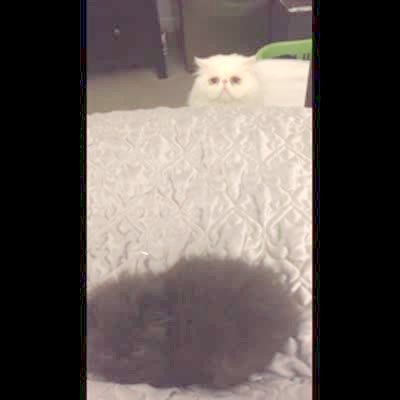 A fluffy brown kitten cat lies on a bed as a jealous white fluffy cat peeks over the edge of the bed.