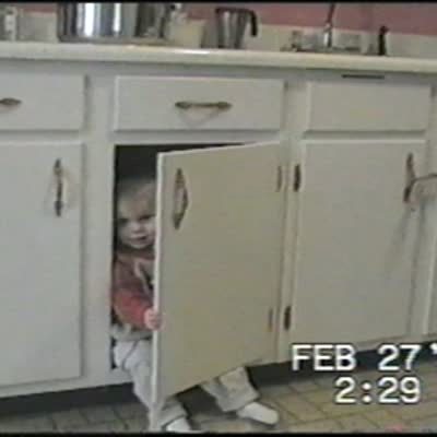 Woman plays peek-a-boo with baby boy who is hiding in cabinet. Woman gets hit in the head with cupboard door when baby suddenly opens it. Baby laughs at woman.
