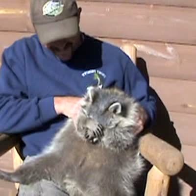 Man holds a pet raccoon on his lap on the porch, tells it not to peek or it'll see a naked woman. Raccoon covers its eyes.