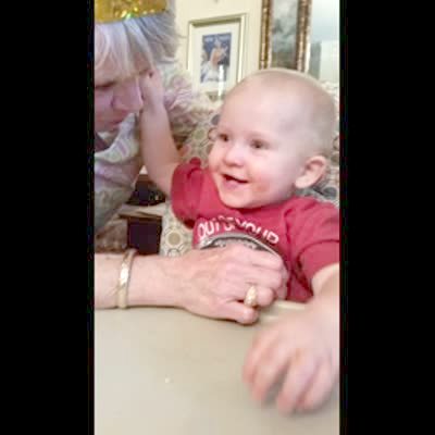 "Baby Sneaks a Peek" - A baby boy looks down a senior woman's shirt and says "wow."