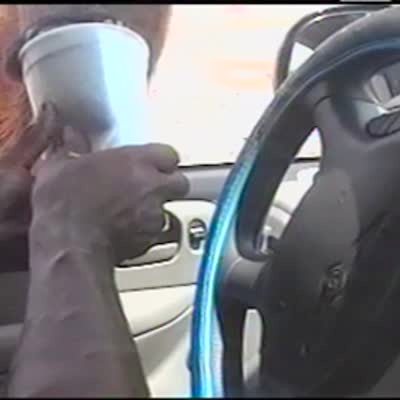 A buffalo peeks through a car window and opens his mouth to be fed from a family as they visit a ranch.