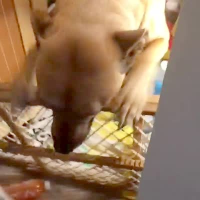 A woman finds her dog inside of the kitchen pantry, and the dog peeks out from behind the food then jumps over a baby gate.
