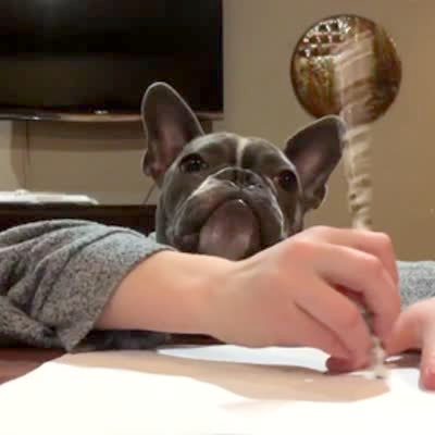 A young child hides in a shirt behind their dog, and pretends it's taking notes with a pencil.