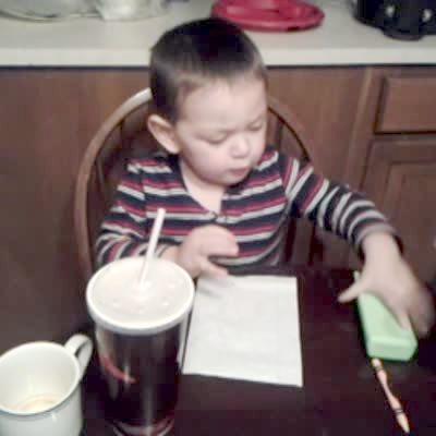 A tot boy angrily yells into a toy plastic phone while sitting at a kitchen table. He throws a pencil and a piece of paper.