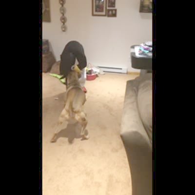 A young girl comes down the stairs in her penguin Halloween costume and her dog immediately attacks her.