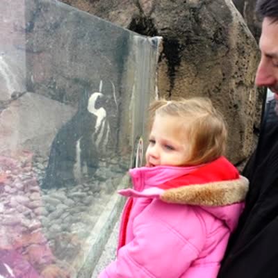 A man lifts his tot girl over glass at a penguin exhibit and one of the penguins bites her.
