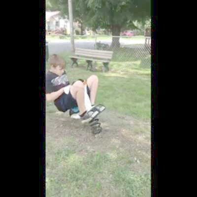 man tries to punch an inflatable penguin decoration on the front-porch but he misses and punches another man in the face. Security footage.