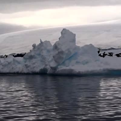 A group of penguins try to jump on an iceberg but fall back into the water.