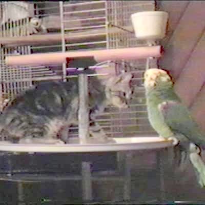 "Cantankerous Cockatoo" A man sits on a chair with a bird perched on his shoulder indoors. The bird screams and attacks his face. Funny starts around 1:00