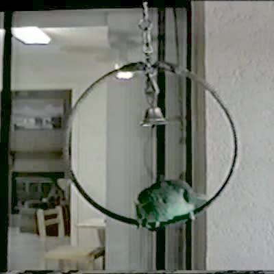 A woman tells a cockatoo bird that she is pretty, and the bird raises her head feathers and bobs up and down until her perch breaks.