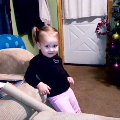 A tot girl tries to kick a cardboard tube perched on an ottoman at home and it flips up and hits her in the head.