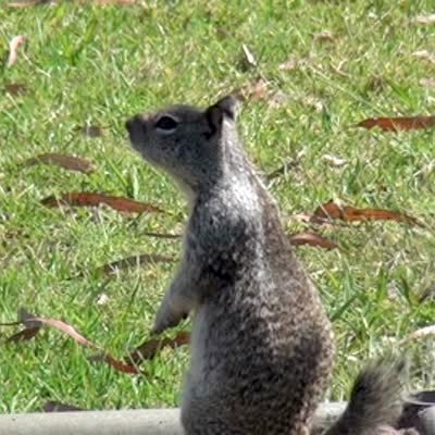 A chipmunk jumps onto a woman's backpack in the woods, and she screams, then it climbs onto her shoulder before jumping to the ground.