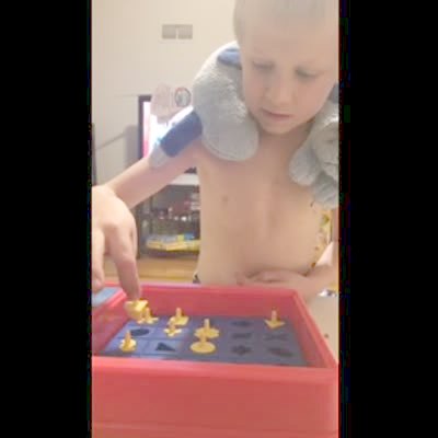 A boy plays a game of Perfection indoors. The timer goes off and the boy gets scared and falls down backwards.