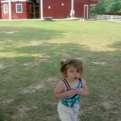 Tot girl at petting zoo looks at goat's butt close up, it farts in her face.