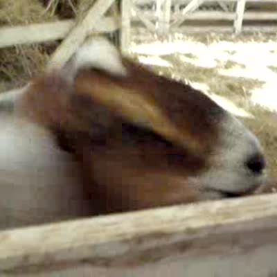 Young girl holds baby goat & tells it to "say baa." The goat does. Then dad says "Say bye, we have to go" and goat says "Baa" again. Petting zoo, farm.