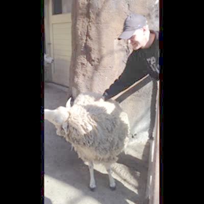 A man grunts when a sheep hits him in the groin with their hoof at a petting zoo.
