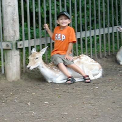 Tot boy counts deer at petting zoo, a deer jumps & knocks boy down. Short tails - mom turned off the camera.