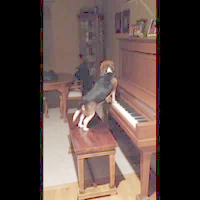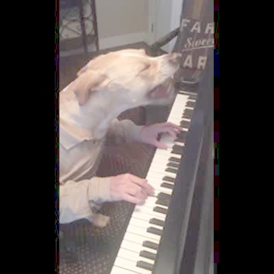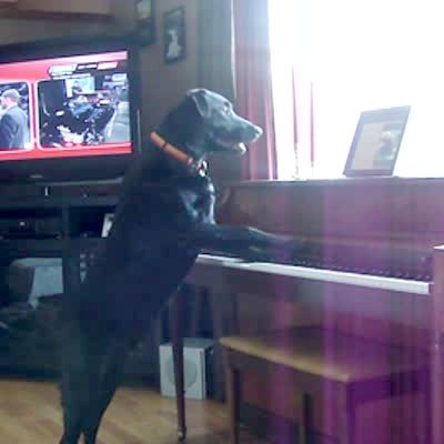 Black lab dog jumps up on piano, pounds keys and howls in living room.