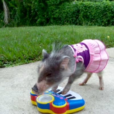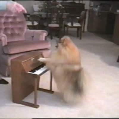 Small fluffy dog plays a toy piano. Annoying pet trick.