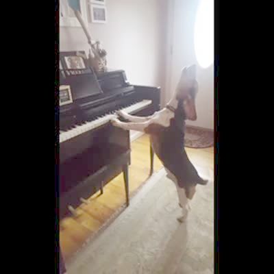 A Beagle dog howls while pressing the keys on a piano at home.