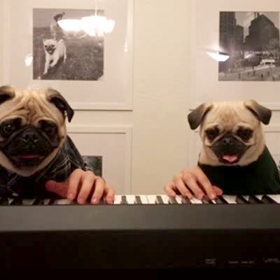 Two pug dogs with human hands play the piano indoors.