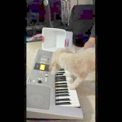 Poodle dog plays a toy piano keyboard. Long for edit