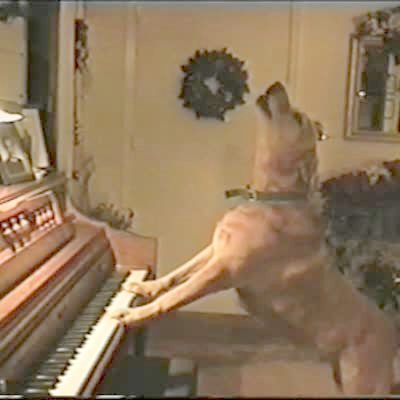 Dachshund dog plays piano and howls. Another long-haired Dachshund joins in singing barking.