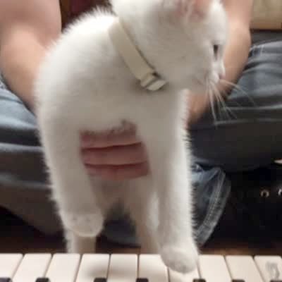 A man bounces a kitten cat on a keyboard piano and it plays along to a demo song.
