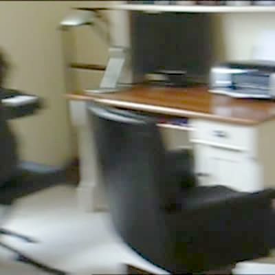 A woman plays saxophone and faints. She falls backwards off of a stool and hits her head. Security footage.