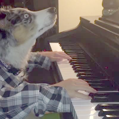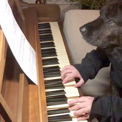 A dog with human hands pretends to play the piano indoors.