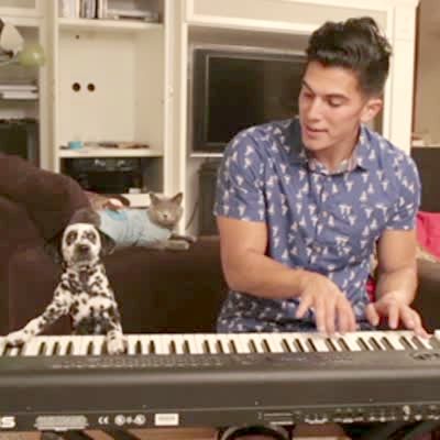 A Dalmatian puppy dog and a man play the Peanuts theme on piano indoors.