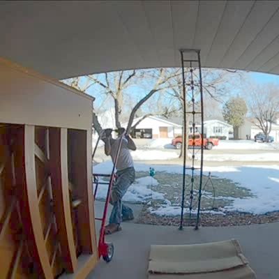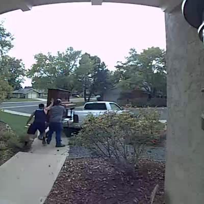 Two men struggle to move a piano down the front porch steps and at 1:20 it falls then hits a pillar. Then a man tries to lift it and rips the leg off, throwing it in the yard. Security footage.