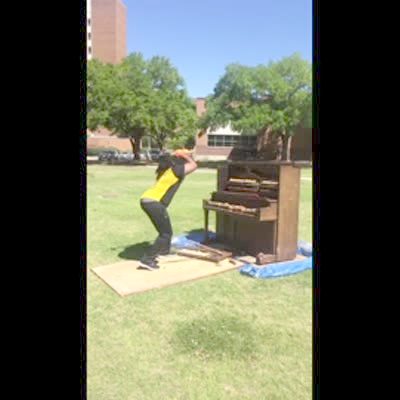 A man uses a sledgehammer to smash an old piano in a field. On the second swing, some wood panels break and bounce up and hit him in the face.