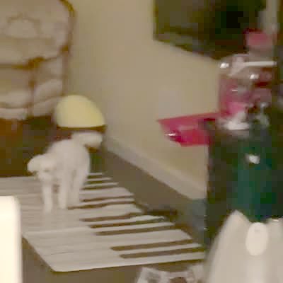 A dog poops on a piano mat in the house, and as it walks away the keys of the mat play music.
