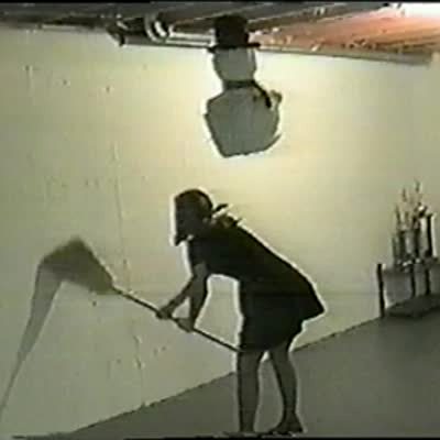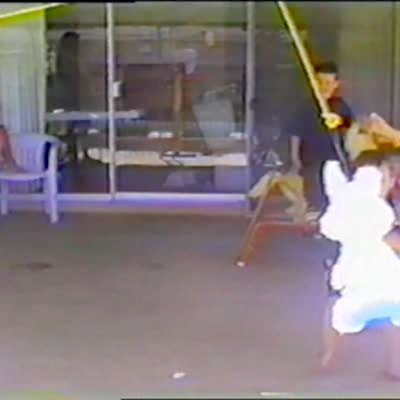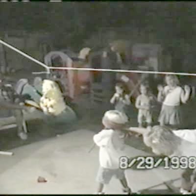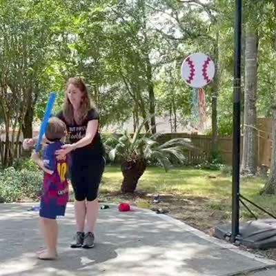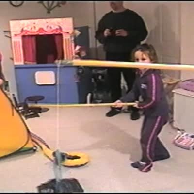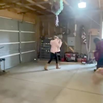 A young girl tries to swing at a pi�ata in the garage, and throws the bat that hits a young boy in the groin.