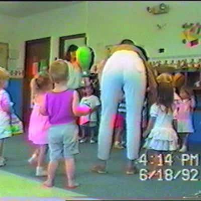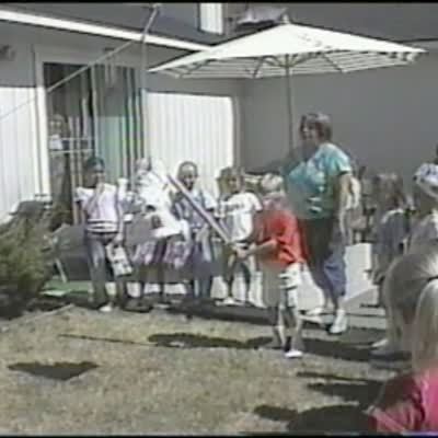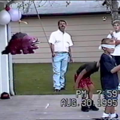 Several kids hit a Pi�ata at a party and when it's a tot boy's turn, he walks in the wrong direction, swings at people as they run away, hits a tree, falls down, then falls down a hill where he takes off the blindfold and swings at the Pi�ata repeatedly.
