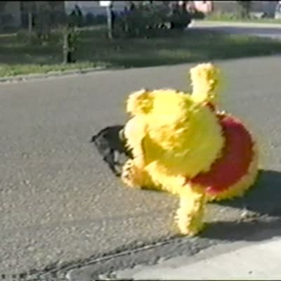 Small dog drags large Winnie the Pooh pi�ata down street as people chase him.