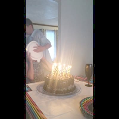 A man blows out the candles on his birthday cake and then another man and a woman throw pies in his face.