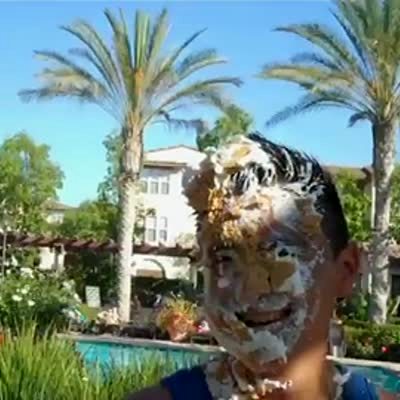 Several people sing Happy Birthday to teen boy next to a pool. Another teen runs in and hits the birthday teen in the face with a pie. Practical joke.