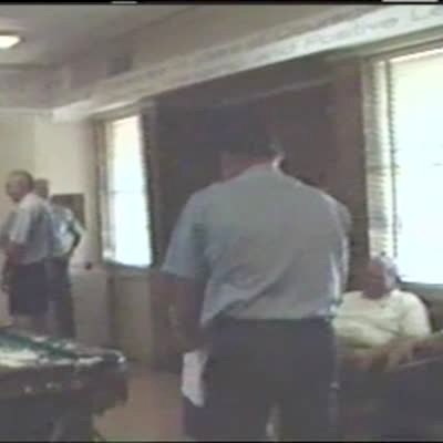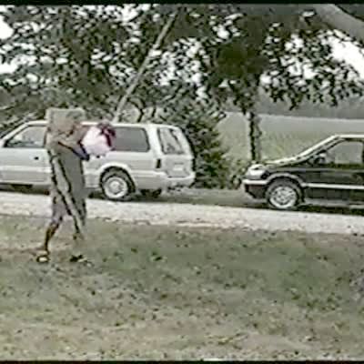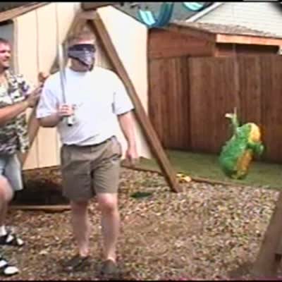 Man is blindfolded, then older man cuts down pi�ata, so man is swinging at nothing. *Long for edit.