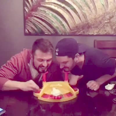 Two young men play the Pie In Face game. A woman walks over and pies one of the young men in the face with an actual pie.
