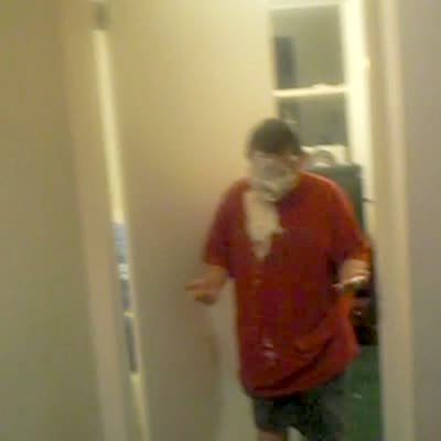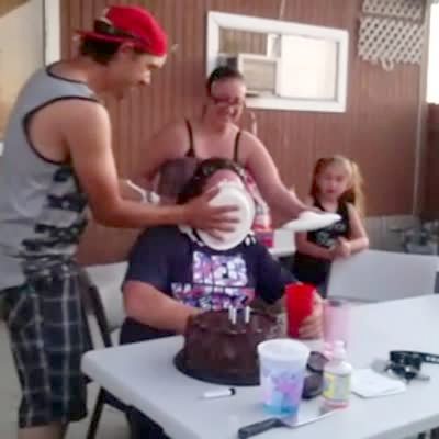 "Two Pie Birthday Guy" Young teen boy is hit with a pie in the face at 6am for his birthday. Practical joke. Surprise.