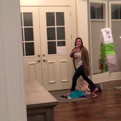 A Rottweiler dog plays the pie face game and gets pied indoors.