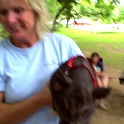Pig puts its nose on dog's butt. Dog spins around and barks at the pig.